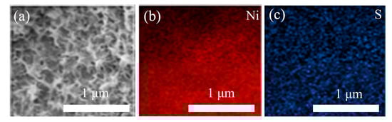 Figure 2 shows the SEM images of NiSx composite on Ni foam prepared using different molar ratios of NiNO3 and thiourea electrolyte. In the low-magnification SEM images (Figure 2a,c,e), NiSx has uniformly deposited on the framework of the Ni foam. Further, NiSx composite thin films showed granular morphology, confirmed by the SEM images at high magnification (Figure 2b,d,f). As the molar concentration of Ni(NO3)2 increased, the thickness and the wrinkle degree of NiSx film also increased. Meanwhile, some microspheres on the surface of NiSx composite films were observed. The increase of microspheres can provide more active sites for redox reaction, resulting in high specific capacitance of NiSx composite. It is worth noting that large cracks gradually appear in the film when concentration of NiNO3 electrolyte increases. Therefore, the tightness of the film is reduced with the increase of Ni(NO3)2 molar concentration. The expanding transverse crack may cause the NiSx composite film to fall off, resulting in a rapid decline in the capacitance of NiSx composite electrode after repeating charge–discharge tests. More detailed morphology was further observed by field-emission scanning electron microscopy (FE-SEM) and a transmission electron microscope (TEM), as shown in Figure 2g–h. The FE-SEM image (Figure 2g) shows that the granular morphology was composed of mangy interconnected ultra-thin NiSx composite nanoflakes with porous structures, which is advantageous for electrolyte to penetrate into the inner space of active materials quickly. The reasons for the increase of wrinkle degree of NiSx film may be as follows. When the concentration of electrodeposition solution is relatively low, the as-prepared films should be relatively dense. As the arrays of supported NiSx nanoflakes gradually form, the film has porous characteristics, so the film will become more and more rough. The TEM image (Figure 2h) further confirms the ultra-thin NiSx composite nanoflakes were overlapping and interconnected. The energy-dispersive X-ray spectroscopy (EDX) mapping was further employed to investigate the elemental distribution of Ni and S. As shown in Figure 3, elements Ni and S were uniformly distributed, confirming the successful deposition of the NiSx nanosheets.