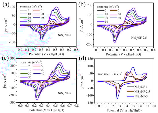 The electrochemical performance of samples NiSx/NF-1, NiSx/NF-2.5, and NiSx/NF-5 were evaluated by a three-electrode system. Figure 4a–c shows the typical CV curves of samples. It can be seen that there are well-defined redox peaks at different scan rates from 2 to 50 mV·s−1, which indicates the Faraday reaction nature of the NiSx/NF electrode []. The redox reaction of nickel sulfides in alkaline electrolyte is expressed as shown below [,,].