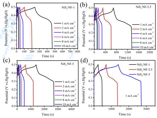 The galvanostatic charge–discharge(GCD)curves: (a) NiSx/NF-1, (b) NiSx/NF-2.5, and (c) NiSx/NF-5; (d) the comparison of GCD curves between three samples at the same current density.