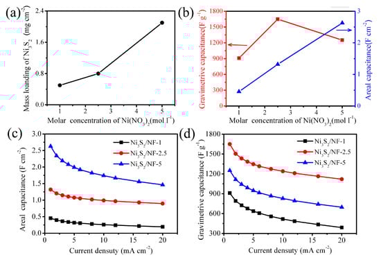 (a) The mass loading of as-prepared NiSx on Ni foam. (b) The areal capacitance and gravimetric capacitance of as-prepared NiSx/NF at the same current density of 1 mA·cm−2 for comparison. (c–d) The areal and gravimetric capacitance of NiSx/NF electrodes as a function of charge−discharge current densities.