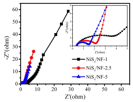The electrochemical impedance spectroscopy (EIS) of the as-prepared NiSx/NF-1, NiSx/NF-2.5, and NiSx/NF-5 was used to study the intrinsic electrochemical behavior, and corresponding Nyquist curves are shown in Figure 7. In the low-frequency region, all curves exhibit a straight line, indicating capacitive behavior. In the high-frequency region, all curves exhibit a small semicircle. The semicircle is related to the electrode surface properties, and the corresponding diameter represents the value of charge–transfer resistance (Rct). The diameter of the semicircle for the samples (NiSx/NF-1, NiSx/NF-2.5, and NiSx/NF-5) decreases gradually, meaning that charge transfer and ion transfer rate have been improved. Further, the intercept of Nyquist curve at the Z’ axis represents equivalent series resistance (ESR). The ESR values of the NiSx/NF-1, NiSx/NF-2.5, and NiSx/NF-5 electrodes are 0.36, 0.34, and 0.33 Ω, respectively. It also indicates the contact resistance at the interface of the NiSx film and Ni foam was very low.