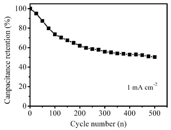 The cycle stability was evaluated by repeating the charge–discharge test for 500 cycles, as shown in Figure 8. In repeated charging and discharging cycles, the capacitance of the NiSx/NF electrode decreased gradually. After 500 cycles, the capacitance decreased to 50% of the original capacitance, suggesting that the cycle stability of NiSx/NF electrode is not good. Based on SEM images, the cracks in the NiSx film on Ni foam can be observed. The repeated charge and discharge process may cause the loose connection between NiSx and Ni foam, and then NiSx drops off from Ni foam, resulting in the decrease of the capacitance of the NiSx/NF electrode materials.