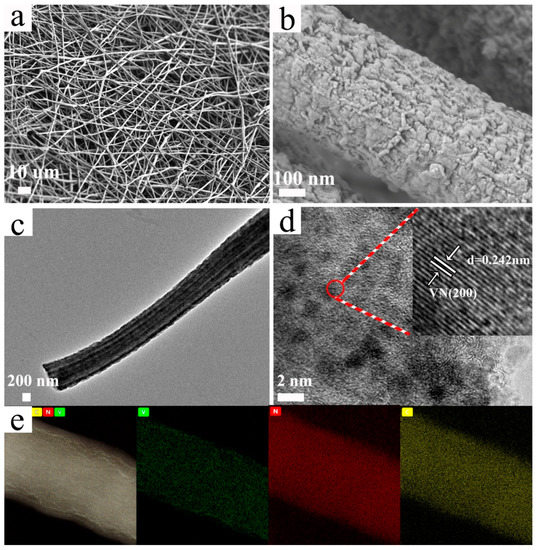 Morphology of VN-decorated multichannel porous carbon nanofibers (MPVN). (a,b) field-emission scanning electron microscope (FESEM) images, (c,d) transition electron microscope (TEM) images and (e) corresponding energy-dispersive spectrometer (EDS) mapping.