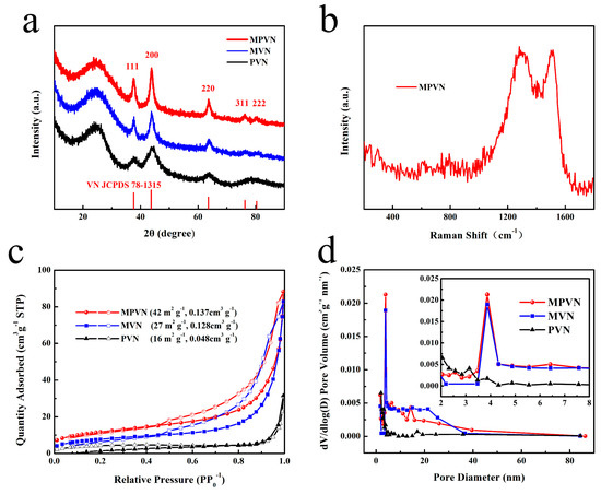 Characterization of materials. (a) X-ray diffraction (XRD) results, (b) Raman spectrum of MVPN, (c) nitrogen adsorption isotherms and (d) pore diameter distribution.