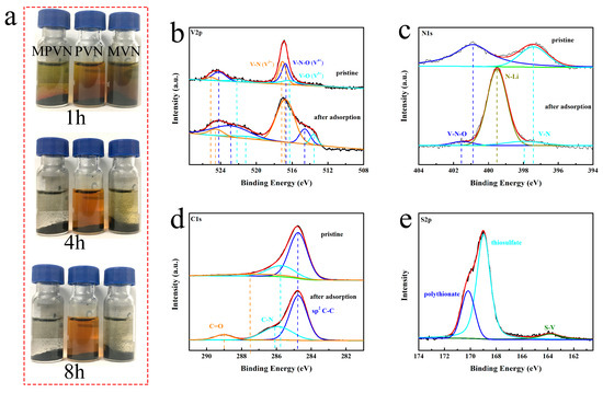 (a) Static adsorption of Li2S6 with MPVN, MVN (VN-decorated multichannel carbon nanofibers) and PVN (VN-decorated porous carbon nanofibers) standing for 1 h, 4 h and 8 h. X-ray photoelectron spectroscopy (XPS) spectra of (b) V 2p, (c) N 1s, (d) C 1s, and (e) S 2p in MPVN before and after Li2S6 adsorption.