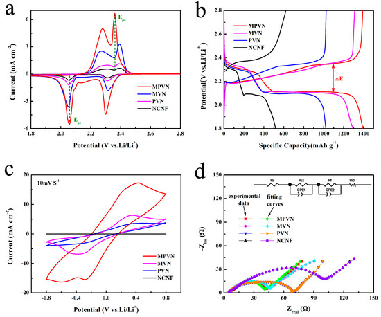 To demonstrate the catalytic effect of VN towards conversion of lithium polysulfides, the cyclic voltammetry (CV) of MPVN, MVN, PVN and NCNF was measured with sulfur areal loading of 3 mg cm−2 at a potential of 1.8 to 2.8 V (vs Li/Li+). The CV curves in Figure 4a reveal the typical reduction and oxidation electrochemical reactions of lithium polysulfides through two pairs of distinct peaks. During the charging reaction, the two evident peaks at 2.28 and 2.36 V may be attributed to the oxidation of solid lithium sulfides (Li2S2/Li2S) to soluble long-chain lithium polysulfides (Li2Sx, 4 ≤ x ≤ 8) and to S8, respectively. In the cathodic scan, the distinct reduction peaks at 2.31 and 2.06 V belong to a multistep transformation from S8 to Li2S2/Li2S. The LSB with MPVN exhibited higher cathodic peak potential (Epc) at 2.06 V and lower anodic peak potential (Epa) at 2.36 V, with a low polarization of 300 mV, compared to the 340 mV of MVN (Epc at 2.05 V, Epa at 2.39 V), 340mV of PVN (Epc at 2.05 V, Epa at 2.39 V) and 350 mV of NCNF (Epc at 2.05 V, Epa at 2.40 V). Furthermore, the LSB with MPVN exhibited noticeably higher current density. The low polarization and high current density of MPVN indicates excellent VN catalysts, which accelerate the redox kinetics of lithium polysulfides. Impressively, the onset potentials depicted in Figure S6a shows that MPVN possesses a larger potential than MVN, PVN and NCNF, which can be attributed to reduction of long-chain soluble Li2Sx (6 < x < 8) to short-chain Li2Sx (4 < x < 6). Besides, Tafel plots, which are an effective tactic for identifying the catalytic effect of VN on the conversion of lithium polysulfides, showed that MPVN had a decreased Tafel slope of 52 mV dec−1, compared to 55, 58 and 65 mV dec−1 of MVN, PVN and NCNF, respectively, further confirming the accelerated redox kinetics of lithium polysulfides (Figure S6b). EIS was also measured before and after cycle tests to further analyze the redox kinetics. The Nyquist plots (Figure S7a) of Li–S batteries before cycling consisted of a semicircle (high frequency region) and a straight line (low frequency part). The semicircle (high frequency region) corresponds to charge transfer resistance (Rct) within cathodes [64]. The Rct of MPVN (30 Ω cm−2) was evidently lower than those of MVN (39 Ω cm−2), PVN (56 Ω cm−2) and NCNF (77 Ω cm−2), indicating the enhanced redox kinetics of MPVN. The slope of the short line (low frequency region) is related to the solid-state diffusion process of Li+ into the electrode materials, where the smaller slope of MPVN indicates increased ion diffusion efficiency. After 3 cycles, the Nyquist plots had two semicircles in the high and medium frequency regions and a short line in the low frequency region (Figure S7b). The semicircle in the high frequency region corresponds to Li+ diffusion through the surface of nanostructure, which appears after cycling because of the formation of insulated Li2S2/Li2S on the surface or near-surface of the electrode materials. The semicircle in medium frequency may be ascribed to charge transfer and double layer capacitance. The Rct decreases to 5 Ω cm−2 for MPVN after 3 CV cycles, which may be ascribed to activation of homogenous sulfur diffusion on the current collector, penetration of electrolyte into the electrode and increased electrochemical contact area.