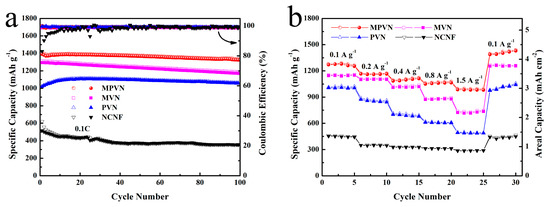 (a) Long-term cycling curves at 0.1 C and (b) rate capability at various current densities (from 0.1 to 1.5 A g−1).