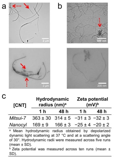 These TEM images also show that the CNT dispersions contain both single CNTs and small agglomerates (pointed out by red arrows in Figure 1). These CNTs were further diluted in CCM at the administered concentrations of 10 and 20 µg/mL, which are known not to alter their stability [19]. Their corresponding TEM micrographs are shown in Figures S3 and S4, respectively. Depolarized dynamic light scattering (DDLS) and zeta potential measurements show CNT hydrodynamic radii in CCM of around 363 nm (Mitsui-7) and 170 nm (Nanocyl) with zeta potentials of −30 mV and −25 mV, respectively. No significant change of hydrodynamic radii nor zeta potential was observed over a longer period of time (e.g., 48 h, see Figure 1c), indicating the stability of BSA-coated CNTs.