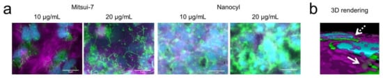 (a) Enhanced darkfield fluorescence images of human lung epithelial cells (A549) after 48 h of exposure to 10 and 20 µg/mL of Mitsui-7 (green, left panel) or Nanocyl (green, right panel). (b) 3D render of z-stack images show the presence of internalized (solid arrow) and strongly adherent Mitsui-7 on the outer cell membranes of the cells (dashed arrow). The F-actin cytoskeletons (magenta) and cell nuclei (cyan) were counterstained with rhodamine phalloidin and 4’,6-diamidino-2-phenylindole, dihydrochloride (DAPI), respectively. The 3D rendering was performed using Imaris software (Bitplane AG, Zurich, Switzerland). Scale bars = 5 µm.