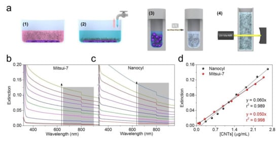 Quantification of CNTs in complex biological media based on the CNTs’ optical extinction properties still possesses some fundamental issues. Several studies have demonstrated that the components of CCM could influence the optical response of the CNTs, leading to an under- or over-estimation of the obtained dosimetry values [28,29]. In addition, the optical extinction properties of CNT suspensions could also be affected by the presence of dispersants [30]. Therefore, in this study, an experimental strategy was designed to measure the in vitro CNT dose by eliminating matrix interferences (see scheme in Figure 3a). Briefly, A549 epithelial cell monolayers (total cell area = 3.8 cm2) were exposed to both CNTs at concentrations of 10 and 20 µg/mL for 48 h (Figure 3a, step 1). The cell layers were then washed to remove non-adherent CNTs (Figure 3a, step 2). After this, the samples were subjected to a microwave-assisted sampling method to extract CNTs (Figure 3a, step 3) by destroying the organic components. Microwave-assisted acid digestion is a well-established method used to destroy, among other things, plasma, tissues, and blood with high efficiency [31]. As a consequence of this analytical treatment, the CNTs become oxidized (becoming O-CNTs), resulting in an increase of their colloidal stability [12]. Oxidized and purified CNTs were then redispersed in water and their optical extinction was recorded using UV-VIS-NIR spectroscopy as the detection method (Figure 3a, step 4). Nanocyl and Mitsui-7 suspensions in CCM at a concentration of 25 µg/mL were subjected to the same treatment and used to perform a calibration curve.