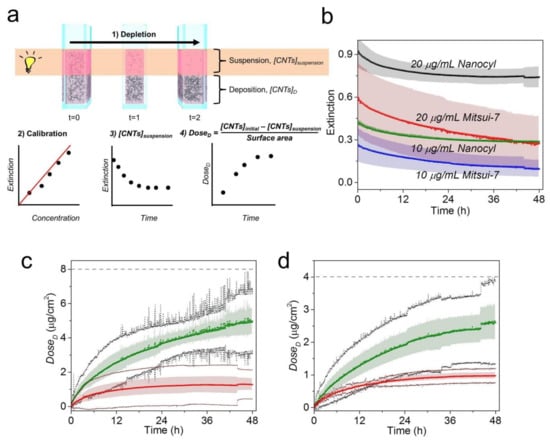 Due to the absence of any standard technique able to verify our result, we followed a sedimentation approach developed by Thomas et al., Cho et al., Rischitor et al., and Spyrogianni et al. [8,33,34,35] which has been successfully used for the quantification of concentrations of spherical nanomaterials such as gold nanoparticles. In this regard, the dose of nanoparticles arriving at the bottom of the cell culture wells (referred to here as estimated DoseD) is calculated through monitoring of the decrease in particle concentration (i.e., depletion profile) in the upper part of suspension. It is important to note that this approach assumes that all sedimented particles will interact with cells and are considered in the dose calculation; therefore, no cells are needed in the design of the experiment. Owing to the stability of CNTs, which do not change over 48 h (Figure 1c), it is therefore possible to study the CNTs’ depletion profile in CCM by means of UV-VIS-NIR spectroscopy. The procedure is shown schematically in Figure 4a (step 1). The variation in optical extinction in real time over 48 h for both CNTs in CCM was monitored within the upper part of the suspension. Figure S6 shows the spectra set for Mitsui-7 and Nanocyl in which can be clearly observed the decay of optical extinction in both CNTs at the two concentrations, as well as the matrix interferences in the overall CNT-CCM spectra, which include BSA (λabsorbance = 280 nm), proteins (λabsorbance = 413 nm), and phenol red (λabsorbance = 558 nm). Due to the presence of matrix interference, the depletion profile was determined by integration of the spectral window from 640–900 nm (Figure 4b). The extinction values of the depletion profile were then converted on deposited doses of CNTs using Equation (1) (Figure 4a(2–4)). Prior results have confirmed that there is a linear relationship between the optical extinction and concentration of CNTs (Figure S7) and that the extinction coefficients (ε) of CNTs are nearly independent of the wavelength because the CNT concentration range is very low [36]. It should be also pointed out that the absorbance efficiency of single MWCNTs is much greater than the scattering efficiency [37], consequently meaning that the influence of scattering in a well-dispersed and diluted (<1 mg/mL) CNT suspension should be minimal, allowing the utilization of the Beer-Lambert law for determining the suspended CNT concentrations and dose quantification.