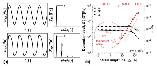 (a) Linear and nonlinear shear stress responses and their corresponding Fourier spectra. (b) Strain sweep test comparing the dynamic moduli, G’, G’’, and relative third relative higher harmonic, I3/1, for the iPP matrix. Notations: SAOS—small amplitude oscillatory shear; MAOS—medium amplitude oscillatory shear; LAOS—large amplitude oscillatory shear.