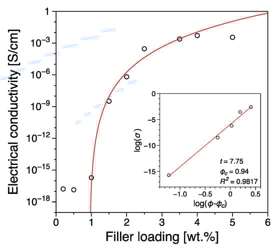 with σo a pre-exponential factor that is dependent on the conductivity of the filler, the network topology and the types of contact resistance. The terms and correspond to the filler concentration and the critical concentration at the transition (also known as percolation threshold) and t the critical exponent. The percolation threshold was estimated at 0.94 wt.% with a critical exponent of t = 7.75. We have measured each sample three times in order to establish the reproducibility of our results and we have observed an average error of ~4% for the reported values of electrical conductivity. The value of the critical exponent observed in this study is significantly higher from the theoretical value ~2 for three dimensions [46,53]. According to percolation theory for a single percolation the critical exponent is dependent only on the dimensionality of the system [53], although non-universal behavior has been reported for experimental nanocomposites with values varying from 1 to 11 [54]. The universality of the critical exponent has been confirmed by a number of numerical calculations of random resistor models [54]. The reason for the significant disparity of the critical exponent value reported in this study with respect to the theoretical predictions is difficult to pinpoint. However, it could be associated with the existence of a multi-step percolation behavior where a tunneling mechanism dominates the current flow between the conductive particles [46,55].