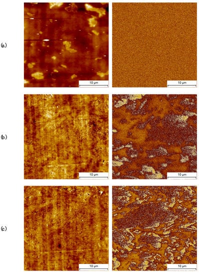 In order to further understand the effect of agglomerates on the electrical conductivity and the extent of the percolation network, images were collected by electrostatic force microscope (EFM). In the vicinity of the macroscopic electrical percolation, the phase images of the EFM mode exhibit only noise, indicating the lack of a well-formed network and of electrical interaction with the tip voltage, despite the clear presence of agglomerates visible in the topography image, Figure 5a. As the network expands and the observed value of the electrical conductivity increases, significant contrast is observed in the EFM phase images, Figure 5b,c. In particular, two different regions can be observed in these images, namely the matrix and the filler agglomerates. Enrichment of charges in the bright area cause the electrical interaction with the AFM tip, in particular disturbing it therefore creating a phase contrast, thus indicating that different parts of the filler contribute differently to the conduction process.