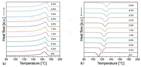 Polypropylene has a very rich polymorphism form and it has been reported that filler inclusion has an effect of the overall morphology of the system [56]. For this reason, we have investigated the effect of the filler in the overall crystallinity and the resulting morphology. Crystallisation and second heating thermograms can be seen in Figure 6 and the overall values for crystallinity are summarized in Table S1. From this, we can clearly see that the crystallization temperature increases with increasing filler loading. At low loadings especially, the increase is quite intense as with just 0.2 wt.% of filler the crystallization temperature increases by 7 °C in comparison with the value observed for the pure polymer (113.6 °C to 120.8 °C). This behavior can be associated with nucleation effects and has been reported in the past for a number of fillers including clay, nanotubes and graphitic platelets [35,61,62].