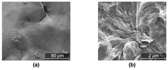 SEM images of (a) large spherulites obtained from the pristine material and (b) lamellae growing from such an inclusion.