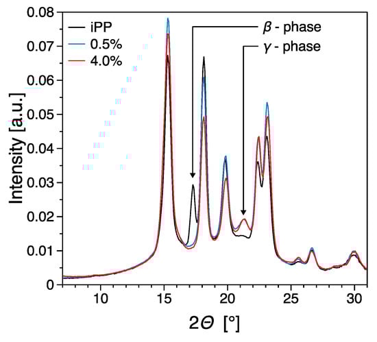 Polypropylene has a very rich polymorphism and it has been reported that filler inclusion has an effect of the overall morphology of filled systems [39]. The iPP used in this work shows generally a large tendency to form crystals in β phase, mostly due to the high purity of this system [66]. The presence of β phase for the pure material is clearly observed from the [300]β peak in Figure 9. Upon nucleation with the filler however β phase disappears, unlike the work of Zhao [67]. Instead, relatively large amounts of γ phase are obtained as visible from the [117]γ peak in Figure 9. Most of these findings are in agreement with the results by Beuguel et al. [65], who showed epitaxial growth of crystals from graphene nanoplatelets. This is also shown in the SEM micrograph of Figure 8b, and in particular transcristallinity from the oriented agglomerates, however no γ phase was observed in that work. The reasons for this difference can be tentatively attributed to differences in the type of filler used and possibly in the iPP used, since nucleation of γ phase is not surprising for metallocene PP, due to the presence of the effects of regiodefects and for PP copolymers with ethylene, however nucleation of γ phase for this iPP in particular in this work, is not something that is commonly observed [63,68].