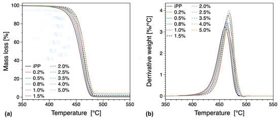 TGA (a) and differential thermo-gravimetric (DTG) (b) curves for the iPP composites with various filler loadings (in wt.%).
