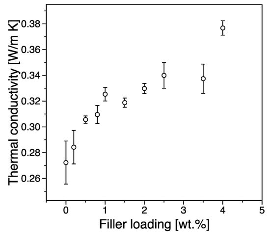 Figure 11 shows the thermal conductivity as a function of filler content. The incorporation of graphene significantly enhances the thermal conductivity of iPP, and the thermal conductivity increases steadily with increasing filler content. From our results we can see that the observed thermal conductivity increases from 0.27 Wm−1K−1 for pure polypropylene to 0.37 Wm−1K−1 for a system with 4 wt.% filler exhibiting an increase of ~37%. Heat propagation in graphene/iPP nanocomposites is generated mainly due to acoustic phonons and electrons scattering processes. The effective heat conduction of the composite depends on the thermal resistance between filler and the polymer matrix and scattering processes on its interface as well as potential thermally conductive paths created by the existence of the filler network. We can observe a rapid increase in thermal conductivity with increasing filler loading below the electrical percolation threshold indicating that although the overall network is still being created, the dispersion process is efficient enough to allow for such processes to occur. Above the electrical percolation threshold, the increase in thermal conductivity is more gradual, something that can be associated with the possibility of agglomeration and aggregation processes that increase with the extension of the network formation in the matrix. In composite materials, the scattering of phonons is due to the existence of a thermal barrier, originating from an acoustic mismatch at the interface between the organic polymer and the inorganic filler. Therefore, high filler loadings compared to the electrically conductivity threshold (i.e., >25 wt.%) are typically necessary to achieve an appropriately high level of thermal conductivity. Such an increased loading has the potential to represent a significant processing challenge and can in certain conditions cause mechanical properties of interest to deteriorate [42].