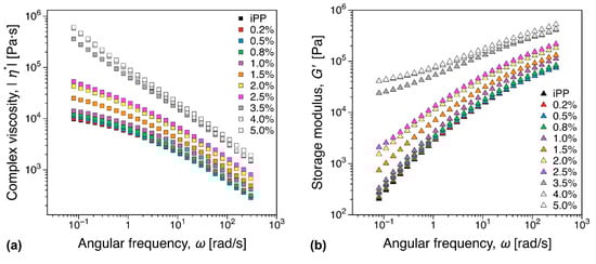 The addition of fillers can significantly increase the melt viscosity and affect polymer chain mobility [70]. Therefore, rheological properties are important for industrial applications primarily as means to assess the nanocomposite processability. Here we focus on two aspects: (i) The increase in complex viscosity and (ii) percolation threshold. Linear viscoelastic dynamic frequency sweep measurements for all concentrations investigated are shown in Figure 12. It should be noted that the empirical Cox–Merz rule is generally not valid for filled polymer systems [71]. However, the complex viscosity at a constant angular frequency 60 rad/s can be considered as a measure of the increase in viscosity, as it is at sufficiently high ω to approach the shear thinning region, while sufficiently low that similar data would be available in most comparable studies. A plot of the relative increase in complex viscosity can be found in the Supplementary information—see Figure S2. Close to the electrical percolation threshold, a 1.42 fold increase in complex viscosity is observed, value comparable to viscosity increase reported for MWCNT nanocomposites [72]. In the conductor region a factor of 7.5 increase in complex viscosity was recorded for the highest iPP filler concentration (5%). In contrast, carbon black alternatives can reach 40% in filler concentration and increase the complex viscosity with a factor of up to 10 [72], significantly hindering their processability. The storage modulus is a typical linear viscoelastic indicator for the existence of a percolated filler network within the polymer as the additional elastic contribution of the filler network can be revealed through the existence of a plateau (solid-like behavior) in the limit of vanishing angular frequencies. In the angular frequencies range investigated, a concentration of over 2.5 wt.% could be there as identified as a threshold concentration. This is significantly higher than the electrical percolation threshold of the iPP nanocomposites, see Figure 3. The third relative higher harmonic, I3/1, is shown in Figure 13 at selected representative concentrations. For concentrations below 1 wt.%, the nonlinear scaling is similar to the general behavior outlined in Section 2.6, see Figure 2b, for the iPP (compare also Figure 13a,b). In contrast, a significant qualitative change in the nonlinear material response is recorded at 1 wt.%. Thus, the I3/1 scaling in the MAOS region becomes angular frequency dependent with angular frequencies greater than 2 rad/s reverting to as it is the case for the iPP. This potentially corresponds to the existence of a weakly formed filler network that is disrupted by the shear flow. A more thorough analysis and further discussion on the interpretation of the nonlinear data in terms of rheological and electrical percolation thresholds, as well as potential nanocomposite morphological fingerprinting is discussed elsewhere [73].