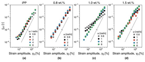 Third relative harmonic, I3/1, in strain sweep tests (a) for the iPP matrix, (b) below percolation (0.8 wt.%), (c) at the electrical percolation (1 wt.%), and (d) above percolation (1.5 wt.%). The instrument noise at low strain amplitudes has been excluded from the graphs, see Figure 2.