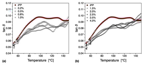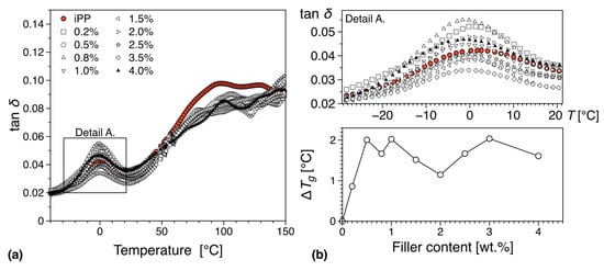 In Figure 14 we can see the mechanical loss tangent (tan(δ)) behavior as a function of temperature and filler loading. For the case of pure polypropylene, three molecular relaxations have been reported in the literature, and these transitions namely α, β, and γ are observed with decreasing temperature [74]. For completion, we must note that a fourth relaxation (δ-relaxation) has been reported from dielectric spectroscopy data at −173.15 °C [75,76]. In this work, we have performed DMTA in the region −40 °C to 200 °C, and therefore the γ and δ relaxations are not visible.
