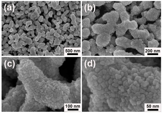In the current protocol, porous worm-like Au could be easily obtained by one-pot route in aqueous solution under the modulation of [N3333][Gly] at room temperature. Its morphology and structure were detailedly characterized and analyzed. Figure 2 showed the field emission scanning electron microscope (FESEM) images of porous worm-like Au. From the low magnified overview Figure 2a,b, one could clearly see that the as-obtained Au samples were uniform in a large scale and represent worm-like structures with the length of 0.3–0.6 µm and the width of 100–150 nm. The high magnified FESEM images in Figure 2c,d showed that porous worm-like Au were composed of lots of small nanoparticles (NPs) with size of 6–12 nm. The NPs had very rough surfaces (see Figure 2b). These results revealed that the well-defined worm-like structures were orderly assembled by the generated Au NPs.