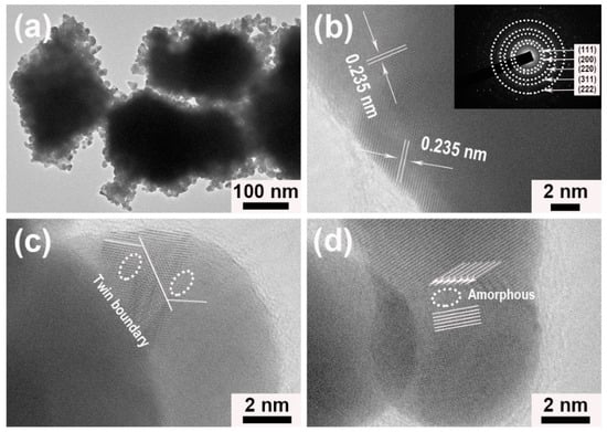 Porous Au worms synthesized in the presence of [N3333][Gly]: (a) transmission electron microscope (TEM) image, and (b–d) high resolution transmission electron microscope (HRTEM) images; the selected area electron diffraction (SAED) pattern is presented in the inset of (b).
