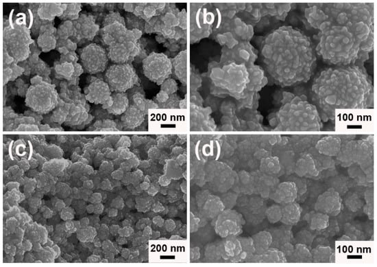 FESEM images of as-prepared Au samples assisted by different ILs: (a,b) [N1111][Gly], and (c,d) [N4444][Gly].