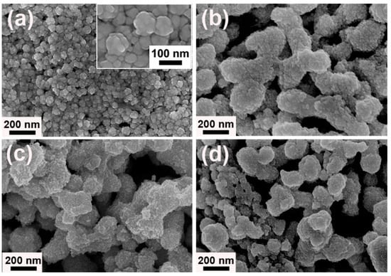 Next, the influences of IL concentration changes were also examined. For this purpose, the concentration of [N3333][Gly] in solution was set to be 50, 150 and 200 mM, respectively. With 50 mM of [N3333][Gly] in aqueous solution, the sample exhibited spherical structures with diameter of about 40–120 nm and rough surface (Figure 6a and the insert). When it came to the typical synthesis (100 mM [N3333][Gly]), the well-defined Au worms with porous structures were obtained (Figure 6b). As the [N3333][Gly] concentration was further increased to 150 and 200 mM, the shape and size of the products gradually became ununiform and some dispered NPs also appeared. At the same time, the porous features were weaker in comparison with porous Au worms (see Figure 6c,d). These results indicated that suitable IL concentration was also vital to the formation of porous worm-like structures.