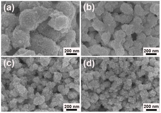 As well known, reaction temperature has significant effect on the reaction kinetics and then the morphology of products. When the reaction was proceeded at 7 °C, larger particles with irregular shapes were aggregated by the as-generated Au NPs (Figure 7a). In the typical reaction at room temperature (about 25 °C), the well-defined porous worm-like Au was assembled by small NPs (Figure 2). As the temperature rose to 40 °C, the size of Au sample decreased, but its uniformity dropped (Figure 7b). Further raising the temperature to 60 and 80 °C, the aggregates became smaller. At the same time, some dispersed NPs also appeared (Figure 7c,d). These results indicated that the reaction temperature surely had obvious influence on the shapes and sizes of products. With the increase of reaction temperature, the size of aggregates gradually decreased and the well-defined morphology became deteriorate, which were in good agreement with the observation [38]. At low temperature, the reaction was slow and less nuclei were formed. Under the synergistic action of [N3333]+ and [Gly]− in ILs and their formed microstructures in solution, these nuclei began to grow and assembly orderly and formed the well-defined porous Au worms. However, at high temperature, the reaction was fast and a large number of NPs were generated at the initial stage. They moved quickly in solution and the interaction of them with ILs were weaken. At the same time, the microstructures of ILs in solution became disordered or even be disrupted at high temperature, resulting in the formation of smaller spherical aggregates and dispersed NP mixtures [39,40]. Thus, room temperature (about 25 °C) was suitable for the growth and assembly of the intriguing porous Au worms in the current case.