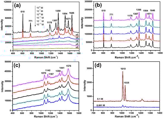 Another important factor affecting the SERS applications was the reproducibility. To this end, five randomly chosen positions in porous worm-like Au film were measured and are shown in Figure 9b. It could be clearly observed that the SERS spectrum of R6G on the five positions was very similar, with less than 2% average relative standard deviations (calculated by the peak intensity at 610, 1358, and 1646 cm−1), demonstrating the extremely high reproducibility.