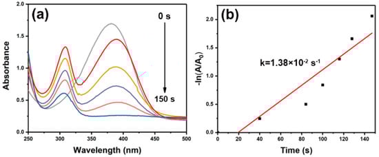 P-NA reduction reaction with porous Au worms as catalyst: (a) absorption spectrum as a function of time, and (b) the plot of −ln(A/A0) versus reaction time.