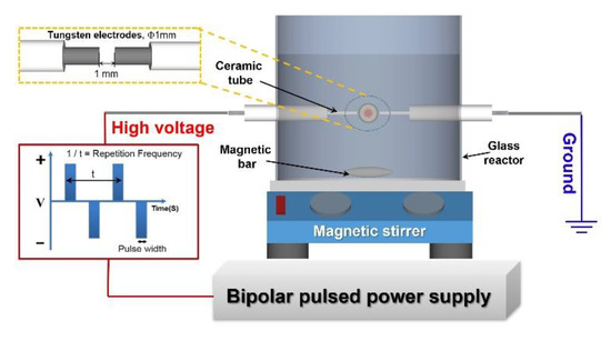 The SPP equipment is shown schematically in Figure 1. A pair of tungsten electrodes (1 mm diameter) were sandpapered to clean their surface and then insulated with ceramic tubes and fitted to the 100 mL glass reactor vessel using a silicone bung. The gap between the two electrodes was set at 1 mm.