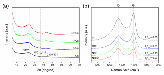 Representative Raman spectra of the Cn, Ocn, NCn and NOCn samples are shown in Figure 2b. Only two bands were found in the spectra; the G band at around 1585 cm−1 and the D band at around 1335 cm−1. The G band represents the vibration of sp2 orderly bonded carbons, while the D band corresponds to the vibration of sp3 carbon atoms, indicating the defects on the graphene layer. The intensity ratio of the D and G bands (ID/IG) was used to evaluate the degree of defection or disorder on the carbon framework [27,28], with the results summarized in Table 1. The Cn and Ocn samples showed a similar ID/IG ratio value of around 0.83 and 0.81, respectively. After nitriding at a high temperature to obtain NCn and NOCn, the ID/IG ratio was increased to 0.93 for NCn and 0.97 for NOCn. This indicated that nitrogen doping caused defects on the carbon framework [29], and then the structure became less crystalline. A slight shift towards a higher Raman shift of the G band was found in the spectra of the NCn and NOCn compared to that in the Cn and Ocn, respectively. The inverse of ID/IG ratio was applied to calculate the size of the in-plane crystallite, La, via the Tuinstra-Koenig relationship [30], shown in Equation (1):