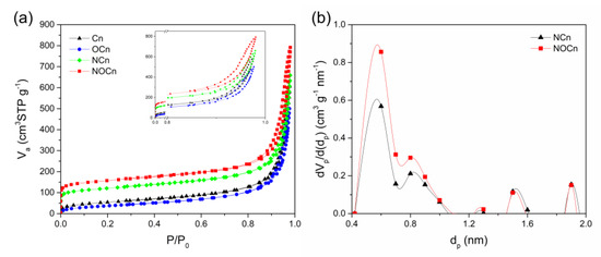 Representative equilibrium N2 adsorption/desorption isotherms at −196 °C for the Cn, OCn, NCn and NOCn samples are demonstrated in Figure 4a. At the initial relative pressure, the first and steepest slope was found. The isotherm of NOCn and NCn exhibited a greater slope than the Cn and OCn samples, which indicated the development of ultramicropores with a diameter of less than 0.7 nm, during the nitriding at a high temperature. From the micropore size distribution via the MP-plot, as shown in Figure 4b, it was evident that most pores in NCn and NOCn had a size of around 0.6 nm. Further increasing the relative pressure up to 0.8, N2 uptake gradually rose. A higher amount of N2 uptake was found when increasing the relative pressure from 0.8 to 1.0. Moreover, an adsorption/desorption hysteresis loop was observed in all isotherms (upper right corner of Figure 4a), which is mainly caused by capillary condensation. Based on IUPAC classifications [31], the isotherms of Cn and OCn expressed the integration of type II and type IV with an H3 hysteresis loop, meaning a non-porous sorbent with interparticle mesopores. The isotherms of NCn and NOCn were attributed to type I and type IV with an H3 hysteresis loop, meaning a porous sorbent with interparticle voids. It is noted that the isotherm of these samples changed from type II to type I after nitriding at 800 °C.