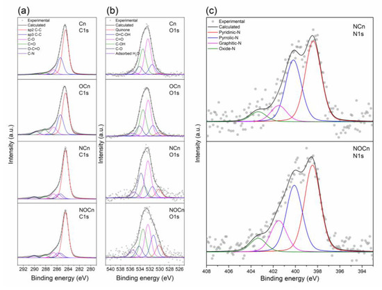 The surface elemental analyses (Table 3) revealed that the oxygen level at the surface of the sample increased from 4.18 at % for Cn to 7.21 at % for OCn, with a 1.77-fold higher oxygen/carbon (O/C) ratio in OCn than that in Cn. This supported that the oxygen-doped samples were successfully synthesized in the one-step SPP at room temperature and atmospheric pressure. It is noted that the N-content was not observed in the Cn sample or the OCn sample. After nitriding at 800 °C to obtain the NCn and NOCn samples, the nitrogen/carbon (N/C) ratio increased to 0.013 and 0.024 for NCn and NOCn, respectively. The nitrogen content in NOCn was around 1.78-fold higher than in NCn, indicating a different way to react with the active species derived from NH3 during nitriding. The NH3 that routed to the nitriding process at high temperature was decomposed to active species that then react with the carbon on the surface of Cn to obtain the NCn with various N-bonds, while they replace the oxygen on the surface of OCn [35], and form a bond with the carbon framework to achieve NOCn, as evidenced in the XPS results (Table 4). Even though the N/C ratio after nitriding increased, the O/C ratio became smaller from 0.044 for Cn to 0.017 for NCn and from 0.078 for OCn to 0.025 for NOCn. Moreover, the bulk elemental analyses (Table 3) showed that the NOCn and NCn samples had a lower carbon level than the OCn and Cn samples, respectively. The decreased O/C ratio and carbon level were perhaps, due to the decomposition of oxygen and carbon at the elevated temperature (800 °C) during nitridation. The change in the carbon level might drive the development of the microporosity, as evidenced in the pore structure studies (Table 2).