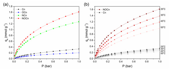 The effect of the temperature on the CO2 adsorption capacity of Cn and NOCn at various pressures is shown in Figure 6b (data provided in Table S1). It can be seen clearly that, at the same equilibrium pressure, the CO2 adsorption was decreased from 1.63 mmol g−1 to 1.37, 1.18 and 0.99 mmol g−1 for NOCn, and from 0.34 mmol g−1 to 0.32, 0.28 and 0.24 mmol g−1 for Cn, as the temperature increased from 25 °C to 35, 45 and 55 °C, respectively. The effect of pressure on the CO2 adsorption capacity differed from that of the temperature. The pressure played an important role in the thermodynamic driving force to push the adsorption forward, and so the CO2 adsorption capacity increased with increasing pressure (Figure 6a). For the temperature, a decrease in CO2 adsorption capacity was observed with increasing temperatures (Figure 6b). Increasing the temperature caused the CO2 molecules to diffuse faster. Therefore, fewer molecules were able to interact with the active site of the adsorbent. Moreover, at higher temperatures, the surface CO2 molecules were desorbed into the surrounding gas once there was adequate energy to overcome the gas-solid interaction [43]. Therefore, increasing the temperature attenuated the CO2 uptake, in agreement with the exothermic nature of the process. The CO2 adsorption capacity of NOCn was greater than that of Cn at the same pressure and temperature. This reflects that these adsorbents have different active sites for CO2 binding on their surface. It also infers that CO2 has stronger interactions with the active sites on NOCn than on Cn, and so more CO2 molecules covered the surface of NOCn, leading to a higher CO2 adsorption capacity.