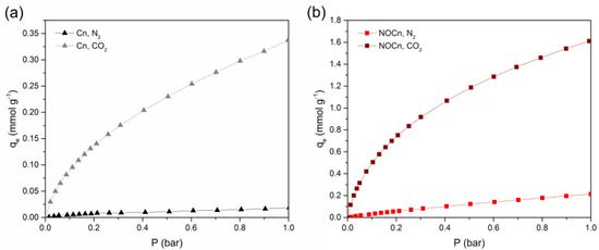 N2 and CO2 adsorption isotherm at 25 °C on (a) Cn and (b) NOCn.