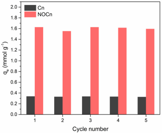 Section 3.4 revealed that the CO2 adsorption on Cn and NOCn was physisorption where CO2 molecules were weakly attracted by Van der Waals forces. This leads to a high possibility for the regeneration of the sorbent. Regeneration is an essential factor in making a sorbent for economical usage. It reduces resource requirement by regenerating spent sorbent and reuse for adsorption application. To test the regeneration of Cn and NOCn, multi-cycled absorption-desorption cycles were conducted. A fresh sorbent was used to saturation in the adsorption procedure as mentioned. After adsorption at 25 °C was completed, the sorbent was regenerated at a temperature of 130 °C under a low pressure (< 0.1 bar) for 2 h and then followed the same CO2 adsorption procedure. The results are shown in Figure 9. The change in the adsorption capacities after five adsorption/regeneration cycles was less than 5% for both Cn and NOCn. This implied that the NOCn and Cn had good stability for multicycle adsorption and evacuation.