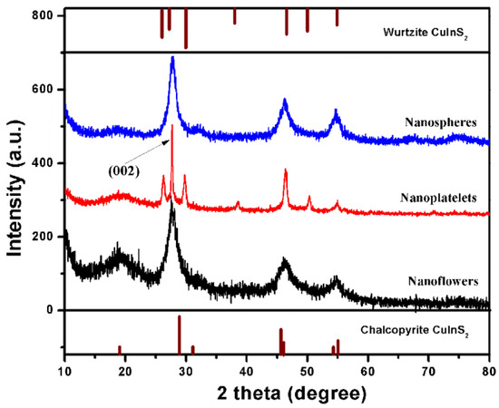 Aiming to reveal the structure and the formation mechanism of differently shaped CIS NCs, they were characterized by powder X-ray diffraction (XRD). Figure 2 shows XRD patterns of CIS nanoflowers (black line), NPLs (red line) and nanospheres (blue line). Based on the standard diffraction peaks of bulk CIS with a chalcopyrite and a wurtzite structure given at the bottom and top of Figure 2, respectively, CIS nanoflowers and nanospheres have a cubic chalcopyrite crystal structure, while CIS NPLs have a hexagonal wurtzite crystal structure. The widened diffraction peaks from CIS nanoflowers are consistent with the smaller size of their constituting individual CIS nanoparticles. Sharper diffraction peaks from CIS NPLs indicate the particles’ greater extent in two of three dimensions, as also seen from the TEM image in Figure 1c. The strong Diffraction peak of the (002) plane of wurtzite crystal’s structure (red line in Figure 2) indicates that the growth of the NPLs occurs along the <001> direction; further evidence for this will be discussed below in conjunction with later HRTEM images.
