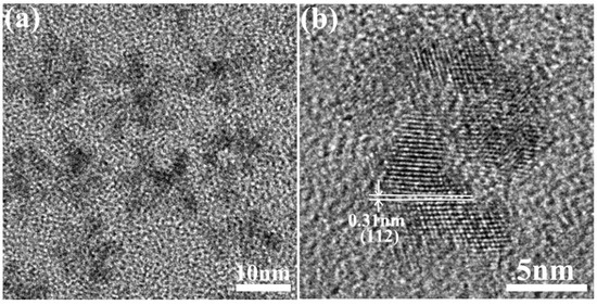 In order to further reveal the detailed structure of CIS NCs, HRTEM was employed. Figure 3 gives the high-resolution TEM image of several CIS nanoflowers, and a HRTEM image of one individual CIS nanoflower, demonstrating that they were built by the aggregation of a few CIS NCs (typically less than ten particles). The overall size of the CIS nanoflowers is about ~15.0 nm, and that of the constituent CIS NCs is between 3.0~5.0 nm. Smaller size of the constituting CIS NCs in CIS nanoflowers results in broader diffraction peaks in the corresponding XRD pattern (Figure 2). CIS NCs in the nanoflowers are single crystalline, with the lattice planes observed clearly in the HRTEM image in Figure 3b. The 0.31 nm fringe spacing corresponds to the (112) plane in the CIS chalcopyrite crystal structure, which agrees with the crystal structure determined from the XRD pattern in Figure 2 (black trace).