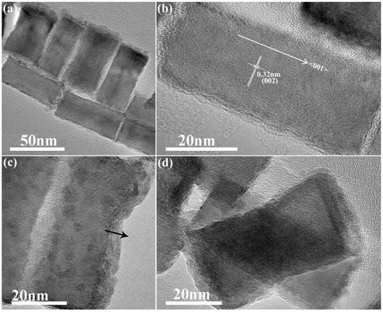 (a) TEM image of a few CIS NPLs; (b) HRTEM image of a single CIS NPL, demonstrating that its length has been extended along the <001> direction, corresponding to the c-axis of the wurtzite structure; (c) HRTEM image of a single CIS NPL with a roughened edge, demonstrating few constituting monolayers; (d) HRTEM image of two overlapping CIS NPLs.