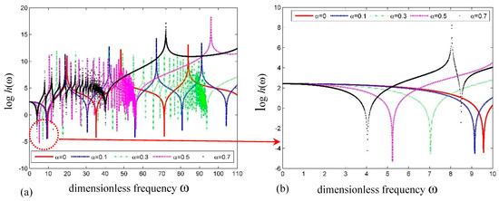 The plots of frequency versus the log of determinant for the cantilevered SWCNT with different dimensionless SSPs α are shown in Figure 5a,b. For the cantilevered SWCNT, the effect of α on the natural frequencies is slightly different from that on a simply supported SWCNT. It can be seen in Figure 5 that all the natural frequencies decrease with increasing α, except the first-order natural frequency, which actually increases.