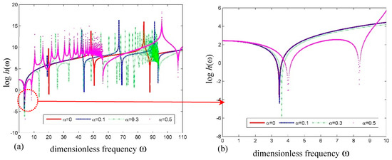 The plots of versus frequency for the cantilever SWCNT. (a) Global curve; (b) detailed curve.