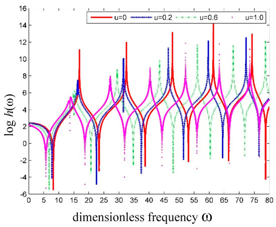 In Equation (28), denotes the element lying at the i th row and j th column of matrix . Set , the natural frequencies can be calculated through a nontrivial solution condition of Equation (28), i.e.,