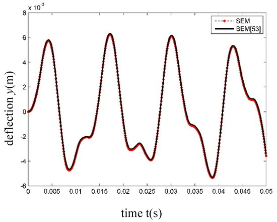 The steady harmonic load is , and the transverse displacement time history curves at x = L/2 are shown in Figure 10. Obviously, the results by the SEM are identical to those by the boundary element method (BEM) [53].