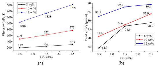 Viscosity (a) and conductivity (b) of spinning solutions with different concentrations of polyacrylonitrile (PAN) and graphene (Gr).
