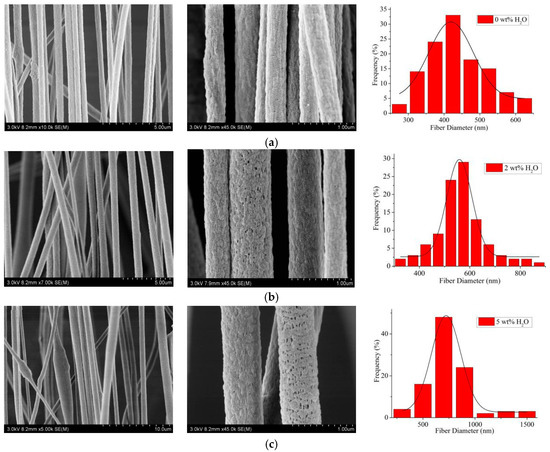 SEM pictures and the according diameter distribution (rightmost) of aligned porous CNFs with different concentrations of H2O by MPEM (Average diameter: (a) 0 wt% H2O, 406.2 ± 11.1 nm; (b) 2 wt% H2O, 561.730 ± 18.9 nm; (c) 5 wt% H2O, 754.64 ± 43.0 nm).