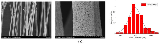 The aligned and nanoporous electrospun PAN/Gr CNFs with a Gr concentration of 0.5 wt% were prepared by the addition of 2 wt% H2O, and the effects of PAN concentration on the CNFs were investigated. From Figure 4, it was evident that with the increase of PAN concentration from 8 to 12 wt%, the average diameter also increased from 368.8 to 579.9 nm, but the beads on the CNFs gradually decreased until they disappeared. Additionally, the alignment degree of nanofibers was improved from 47.1 to 76.0%. That’s because, with the increase of the viscosity, the polymer chains resist electric field-stretching, and the bending instability of jets can be suppressed. As a result, both the diameter and alignment degree of composite nanofibers increased [44,45]. Thus the PAN concentration of 12 wt % was chosen as the future MPEM parameter.